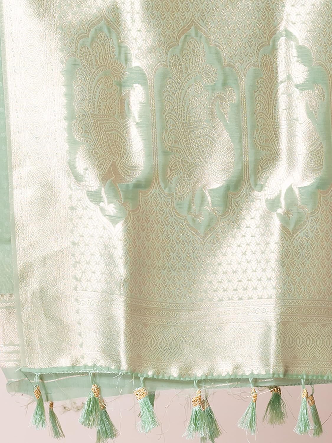 Add a touch of sophistication and heritage to your ethnic ensemble with this Banarasi silk saree. It ensures that you stand out in any celebration or event, exuding charm and confidence.