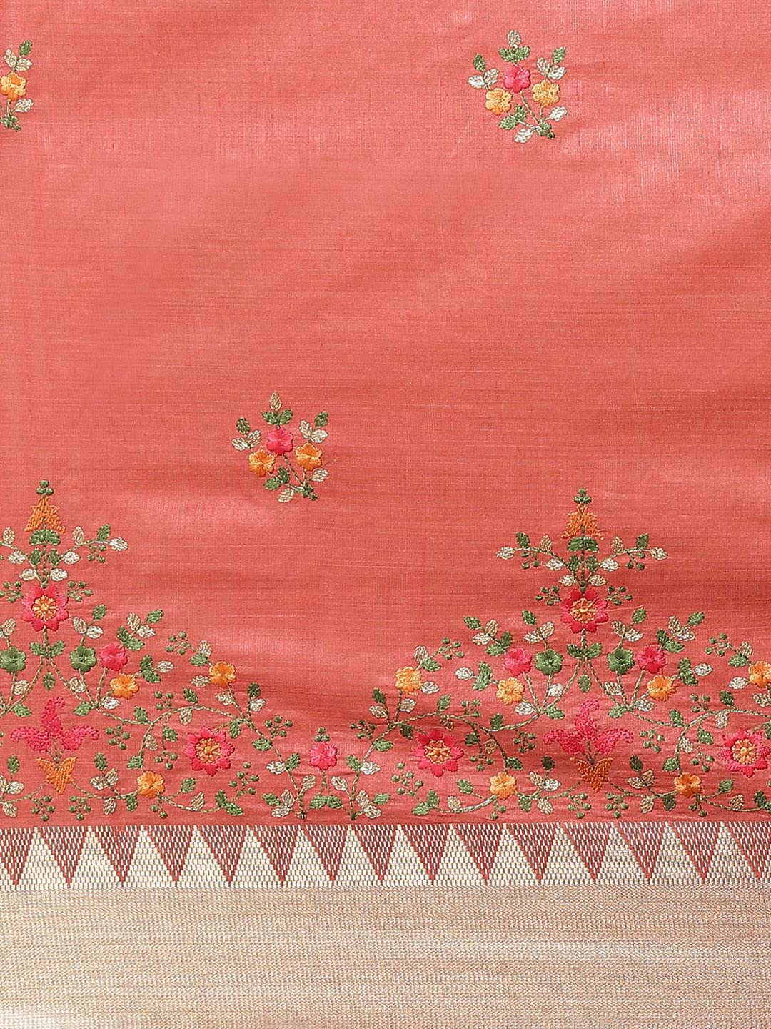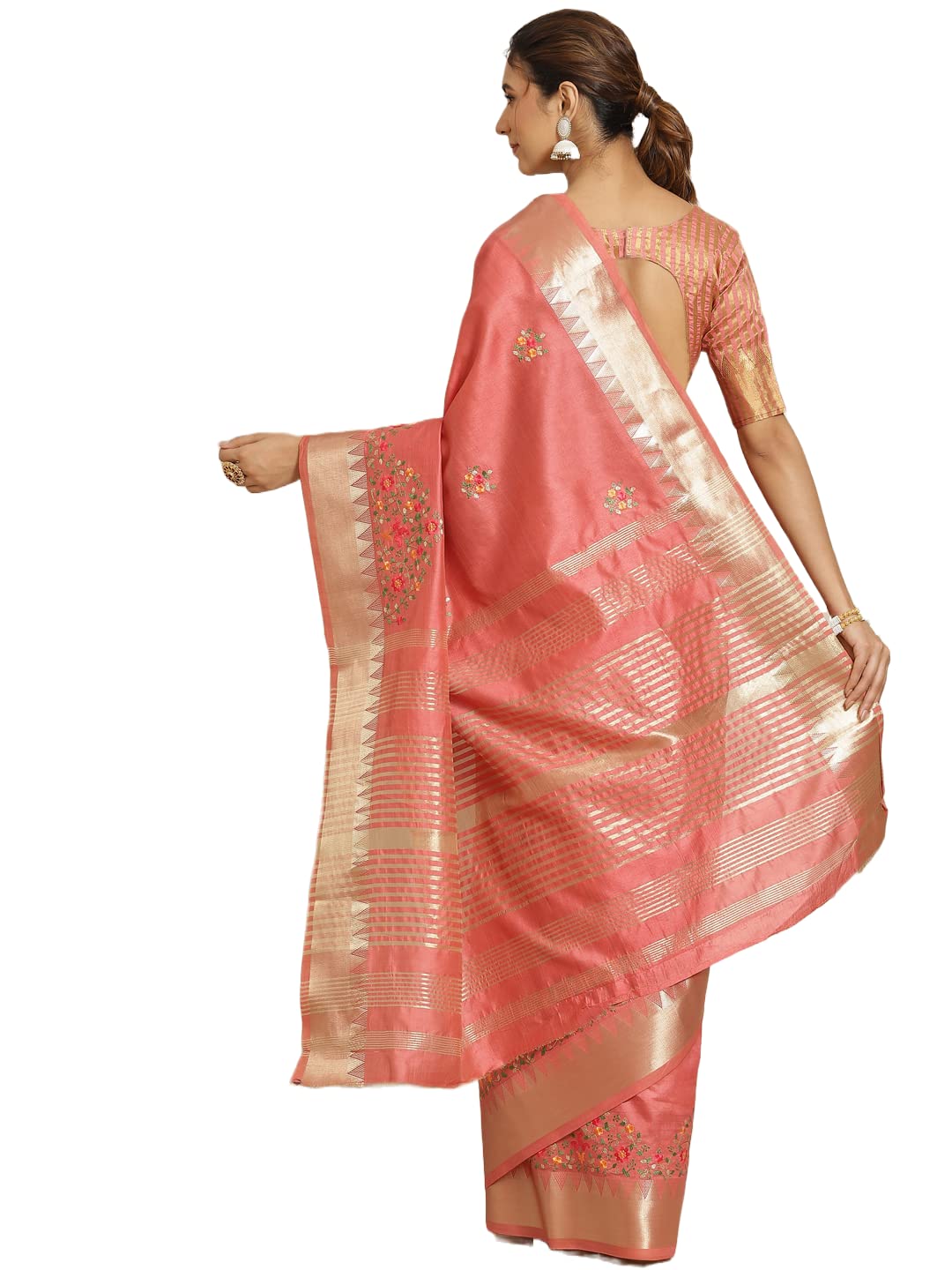 Saree fabric : Assam cotton Silk. Blouse fabric Assam cotton Silk.Work : Multi color thread embroidered Saree With Golden Zari And Temple Contrast border Length : 5.5 Mtr Blouse Length : 0.8 Mtr UnStitched Blouse Type : Party/Festive/Wedding Wear Saree