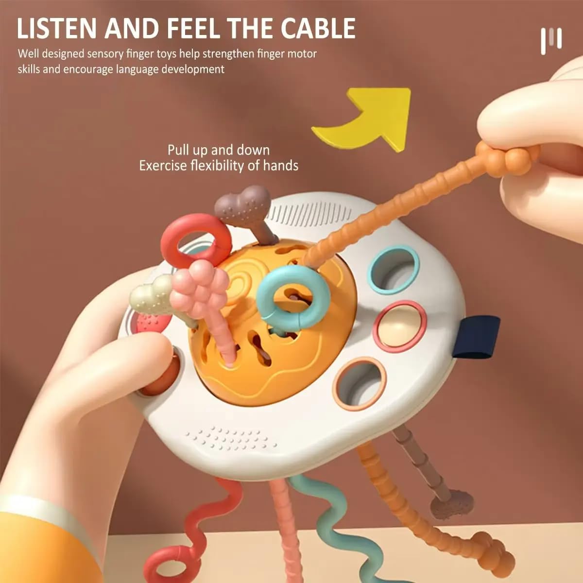 Equipped with 6 differently textured and colored cords, each with varying resistance levels, the toy provides a rich tactile experience. Toddlers develop a sense of depth, grip strength, and dexterity by pulling some cords easily while having to work a little harder on others—mimicking real-world challenges and making playtime more rewarding.