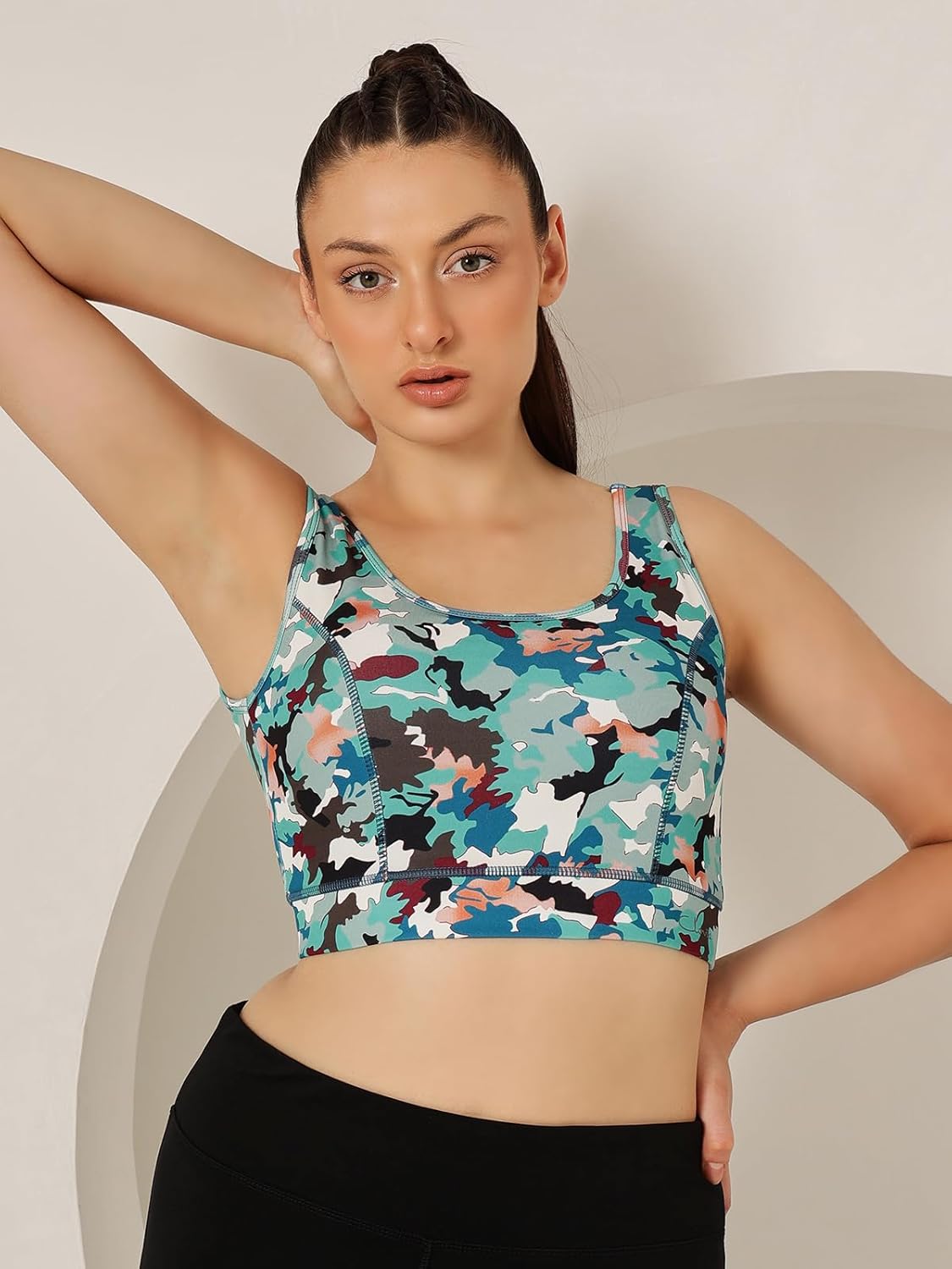 Clovia Women’s Polyester Medium Impact Padded Non-Wired Camouflage Print Sports Bra