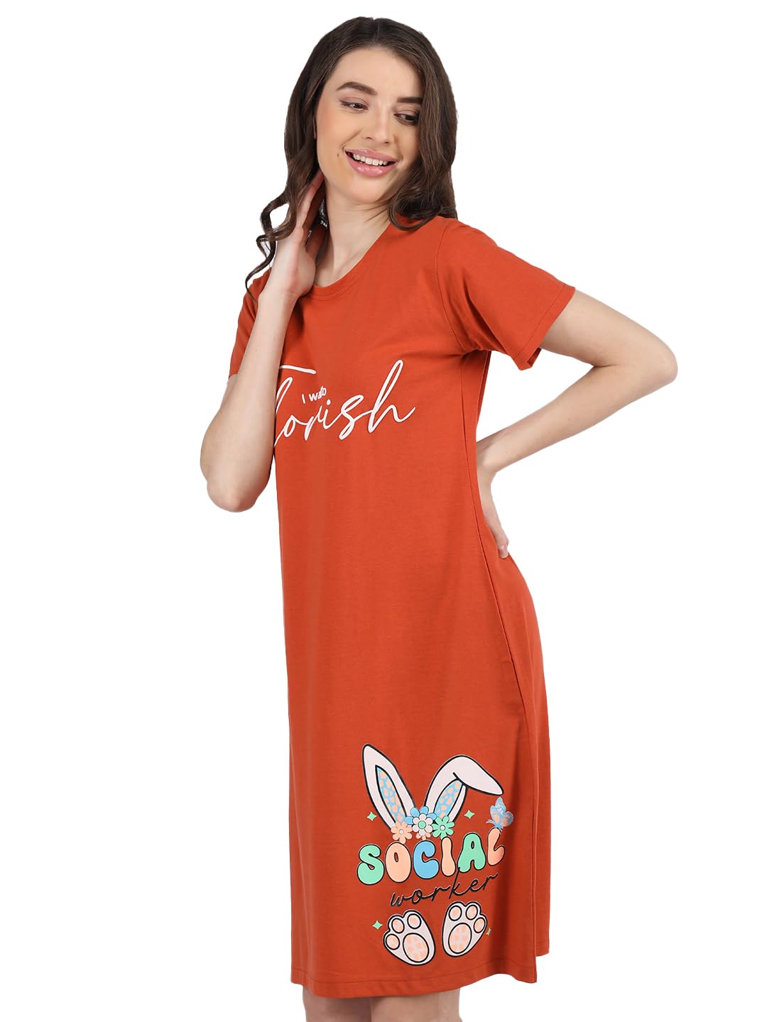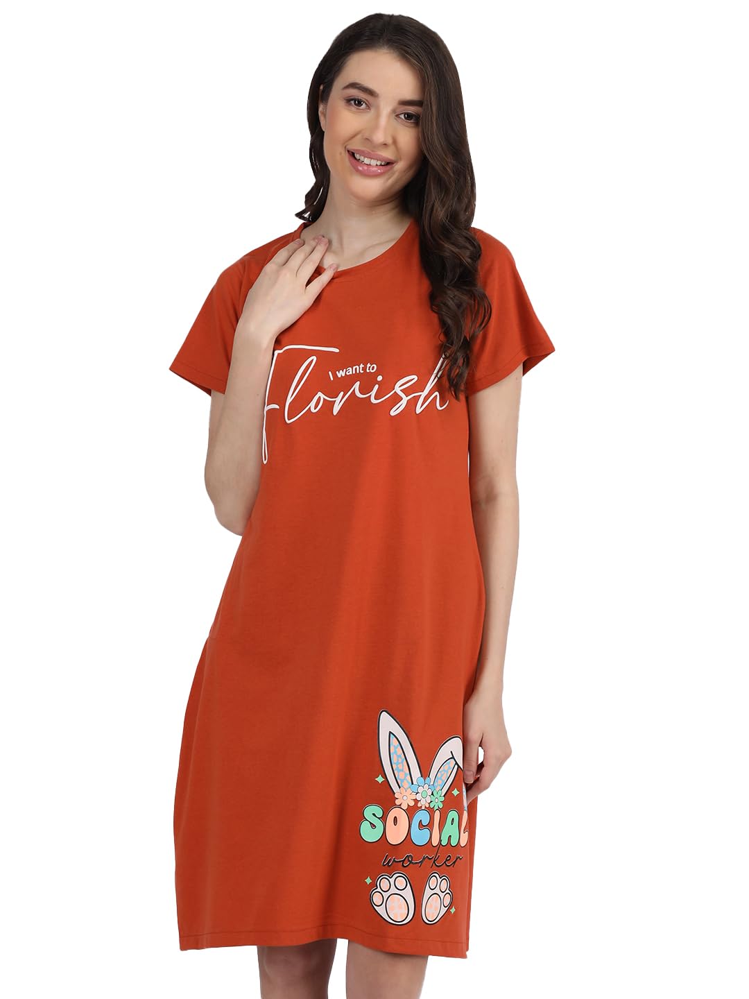 We bring to you a knee length nighty for women that comes with a graceful and feminine printed design. Relaxed fit: Features a comfortable, relaxed fit with a button-up closure and elasticized waistband for ease of wear. Perfect gift for your loved ones, this can be gift wrapped as well Wide range of sizes: Available in various sizes to cater to women of all body types for a perfect fit. Duchess Women’s regular fit knee length night dress for women It features round neck, short sleeves, placement print and curved hem detail Made in comfortable stretch knit fabric that is comfortable on skin.