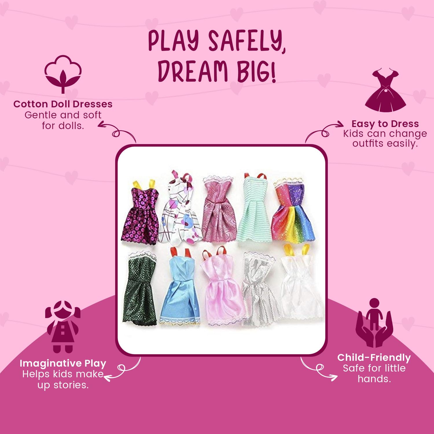 👗【SAFE & DURABLE MATERIALS】: Made from non-toxic, child-safe plastic and soft cotton, ensuring the accessories and dresses are both safe and long-lasting for extended fun.
