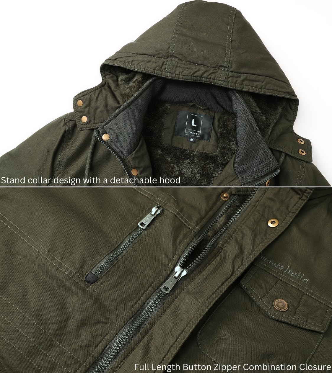 L’MONTE Men’s Winter Cotton Cargo Jacket – Fleece Lining, Detachable Hood, Stand Collar and Ribbed Cuffs – Warm and Stylish Parka for Harsh Cold Weather