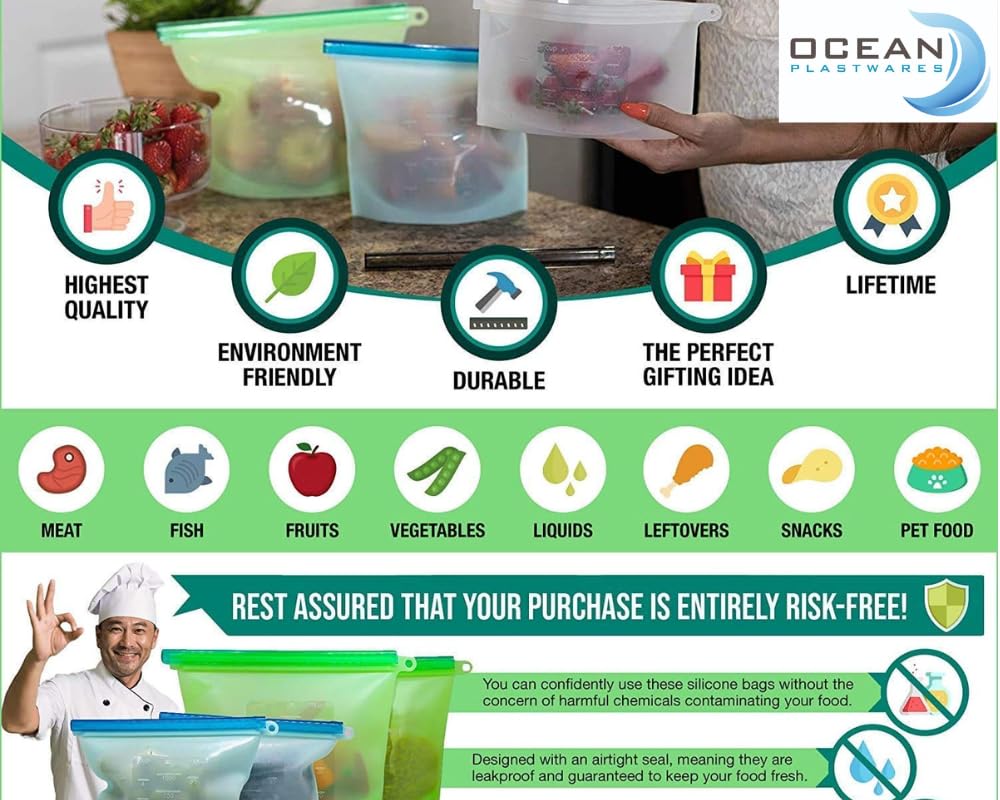 Ocean Plastwares reusable bags are a healthier alternative to single-use food storage bagsThey offer the convenience of single-use food storage bags without the harmful additives found in plastic bagsTake back control of what goes into your food – no more wondering if your food storage bags are doing more harm than good!They’re perfect for freezing leftovers, meal prep, batch cooking, marinating meat, refrigerating ingredients, and more!SIGNAMIO bags can save you hundreds of dollars over your lifetime.Use our high quality bags time after time – they’ll stay like new year after year! The food grade silicone never breaks down with use or when freezing and heating! No more wasting money on single-use bags!Our economically-friendly bags keep more money in your wallet!Our food storage bags are designed to be good for your body and good for the planet! No more single-use bags that sit in landfill for years – offers a more responsible way to store food!Whatever your food storage needs, will meet them in a healthier, more responsible, and economically-friendly way!