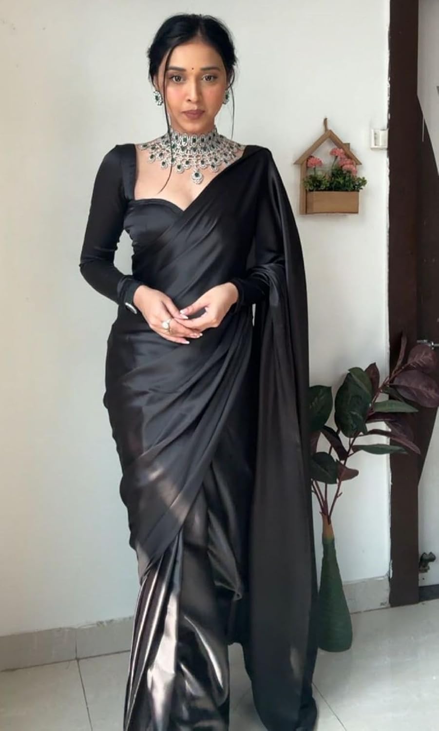 SHOPAZ Women’s Ready to Wear Plain Black Satin Silk 1 Minute Pre Pleated Saree With Black Unstitched Blouse