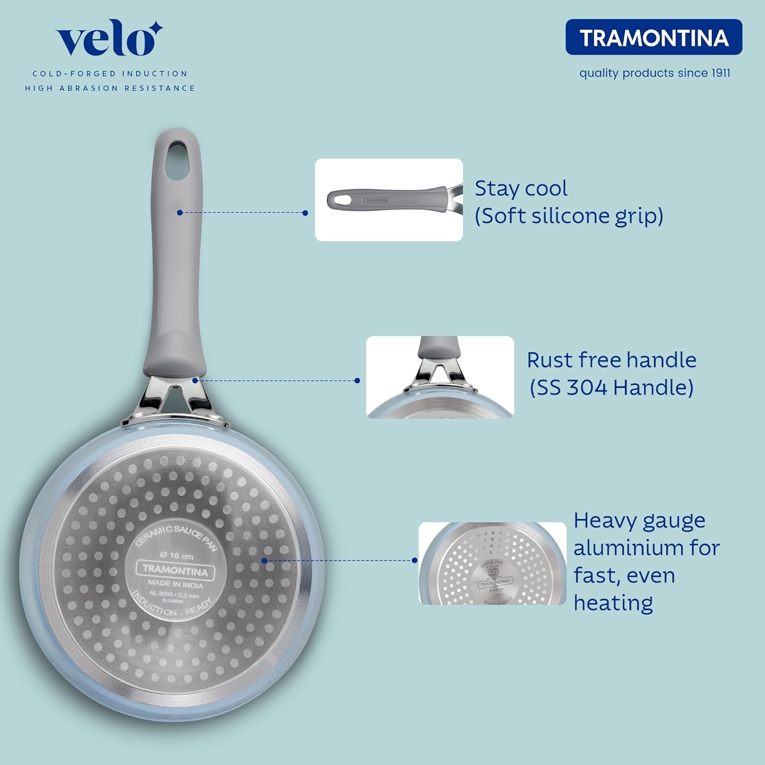 PREMIUM CERAMIC REINFORCED COATING: This Tramontina VELO sauce pan features a premium ceramic-reinforced coating for smoother food release and healthier low-oil cooking. Designed for durability, it is abrasion-resistant.