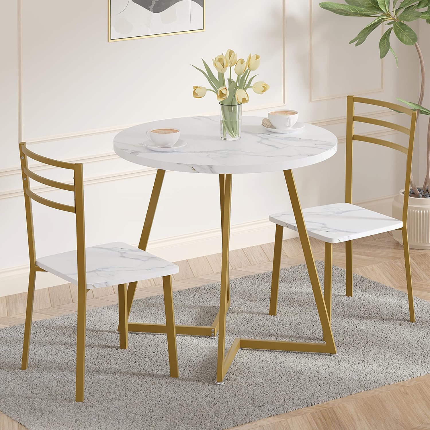 VECELO Small Round Dining Table Set for 2, Wood Tabletop with Strong Metal Frame, Modern Dinette with Chairs for Kitchen, Breakfast Nook Living Room, White and Gold