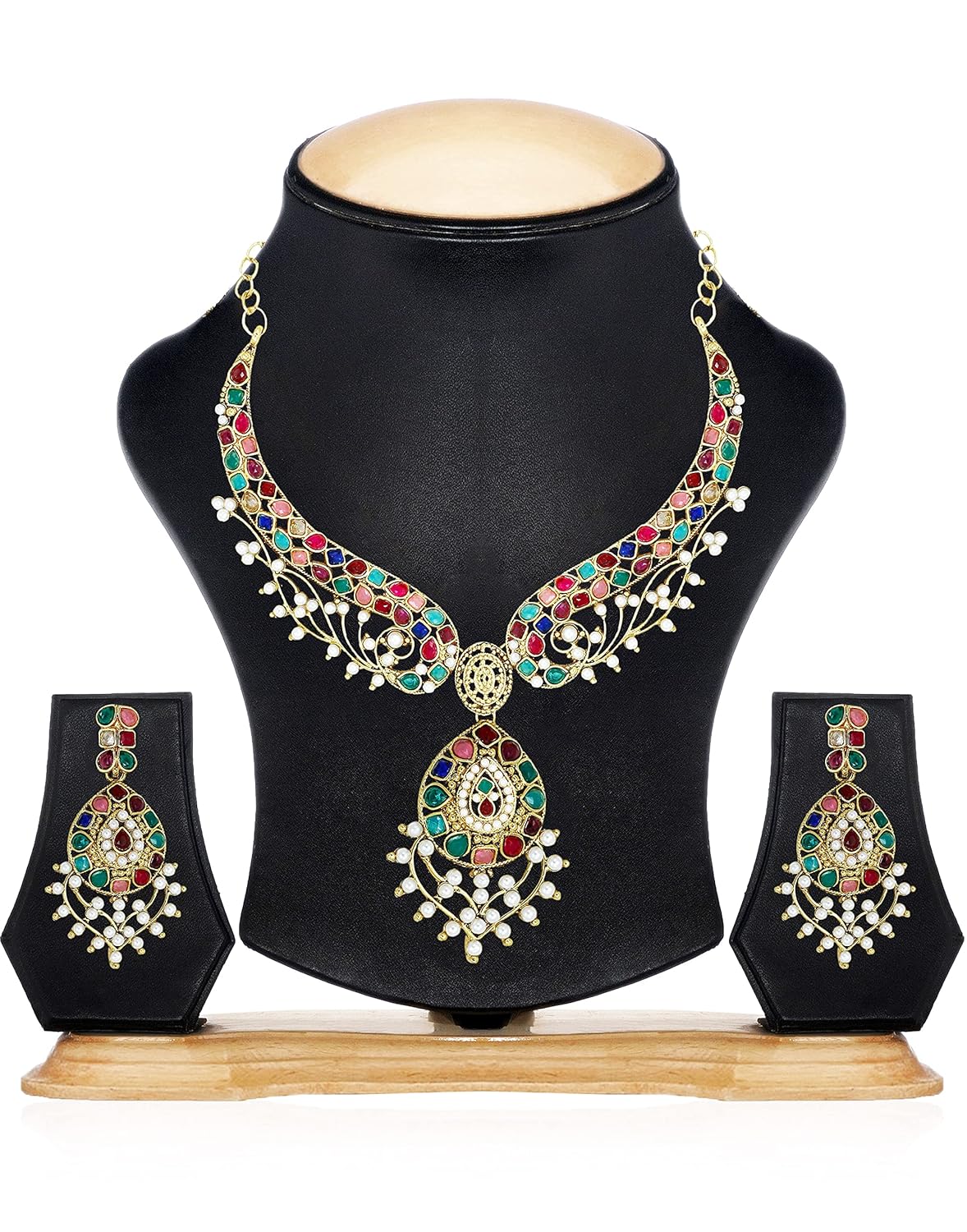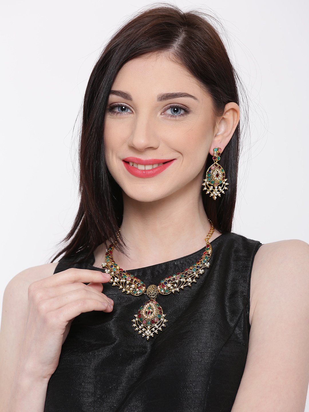 Zaveri Pearls Multicolor Necklace beautifully crafted for every single occasion.Hard-to-miss gorgeous, this set by Zaveri Pearls is a charming mix of tradition and modernity. Club it with a lehenga-style saree and nude makeup to take the party by storm.Green,acqua,Red, Pink, Blue, Yellow, Purple Stones Beaded Necklace with filigree detail and pearls Studded, an adjustable lobster clasp.A pair of matching earrings, secured with a post-and-back closure